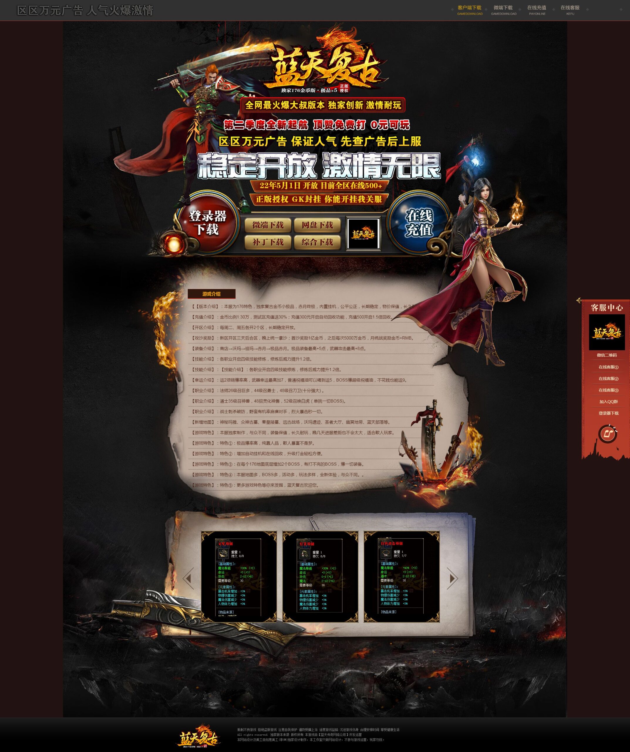 【版本介绍】:本服为176特色,独家复古金币小极品,赤月终极,内置挂机,公平公正,长期稳定,物价保值,长久耐玩。