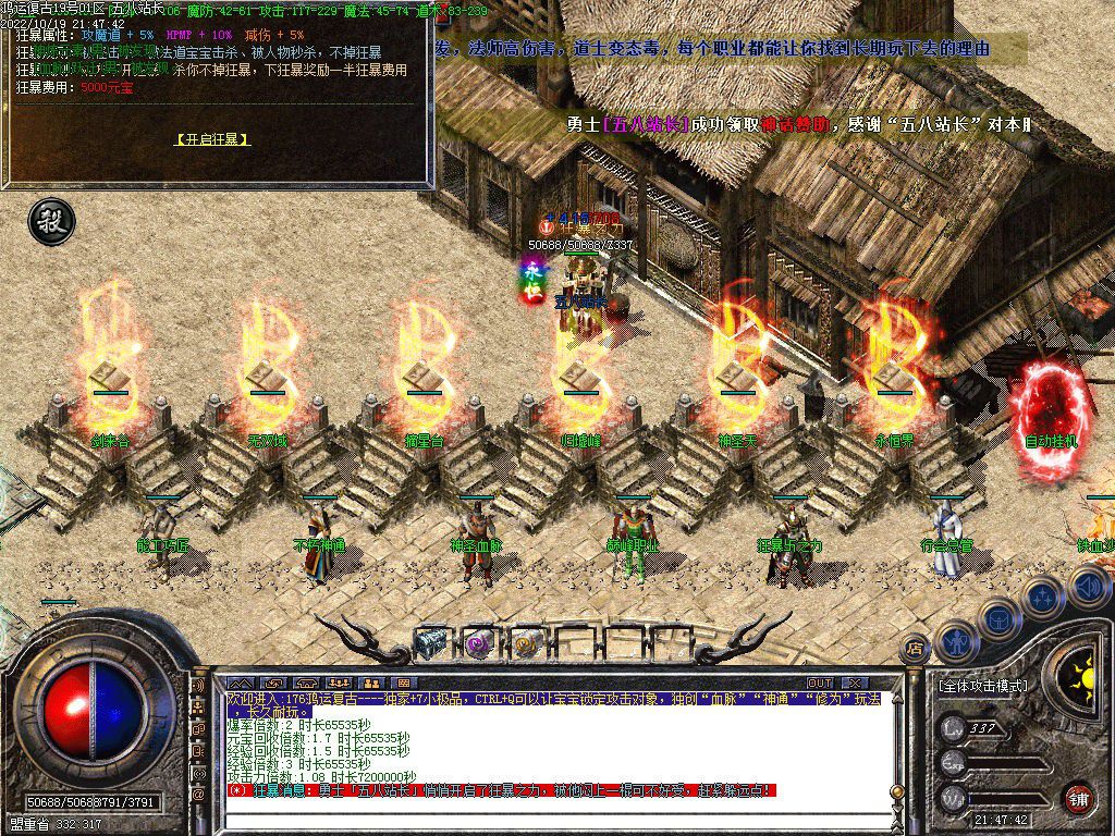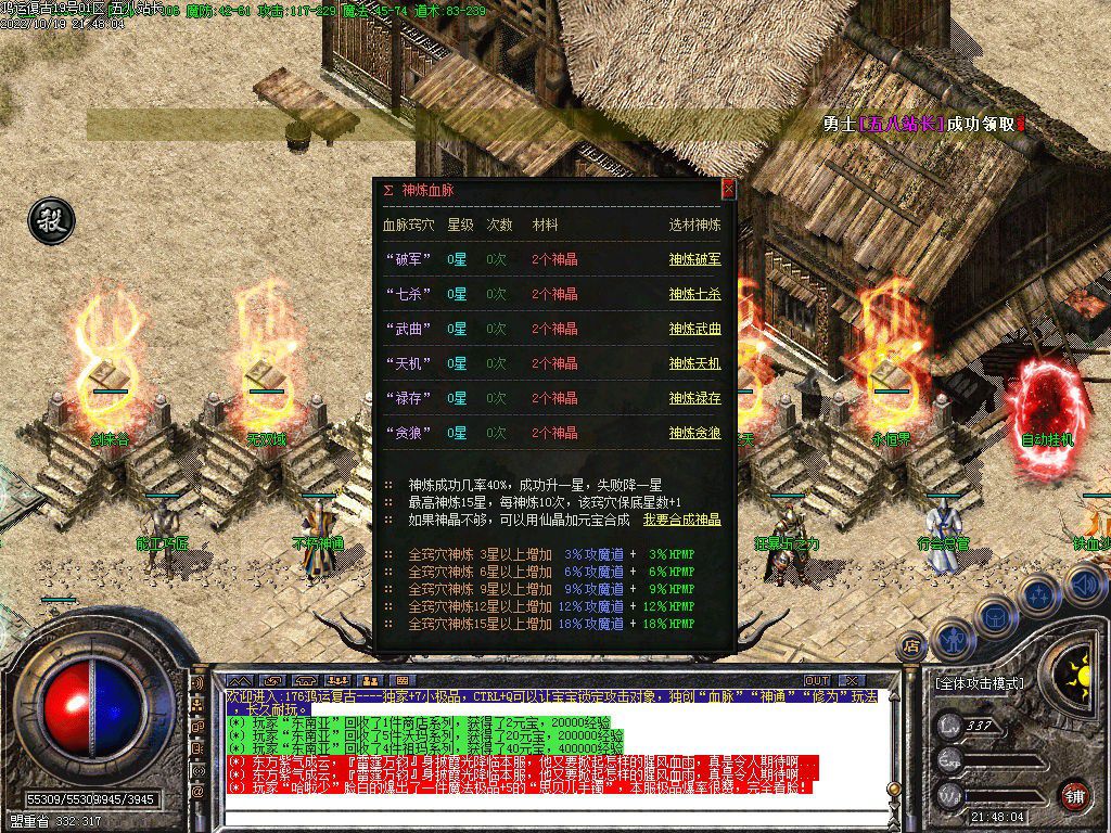 [血脉神技] 战士血脉神技:旋风击,普攻高概率触发,释放旋风对周围怪物造成群伤,审判一击:普攻、技能触发,最高爆出7倍伤害