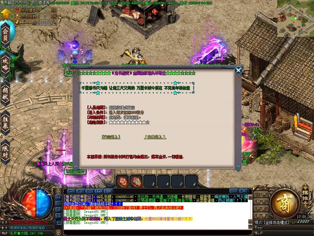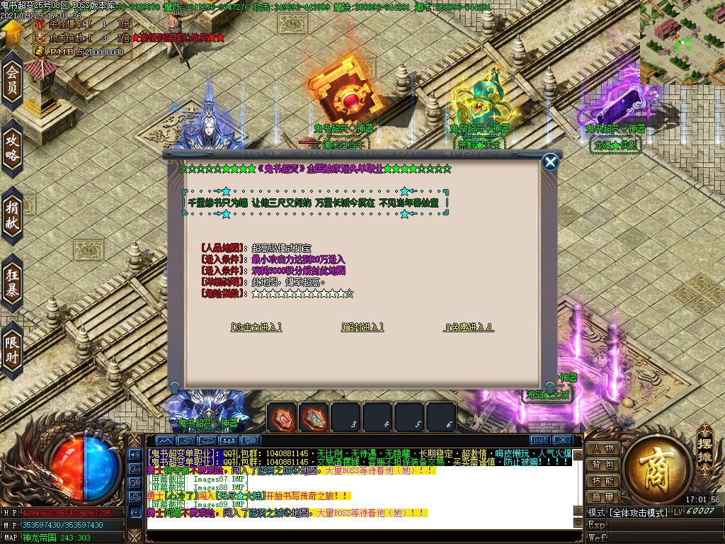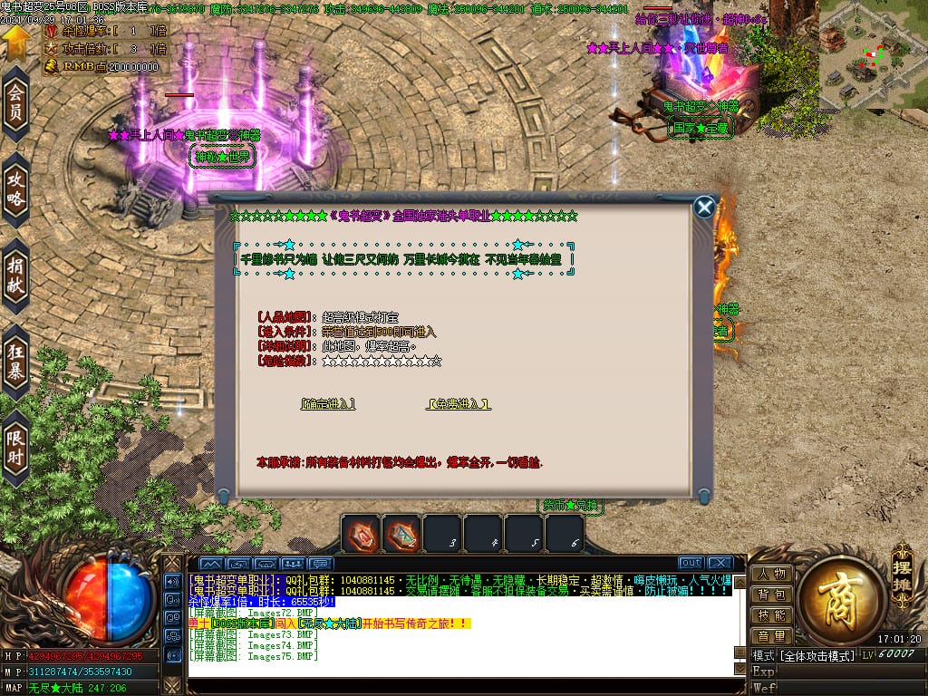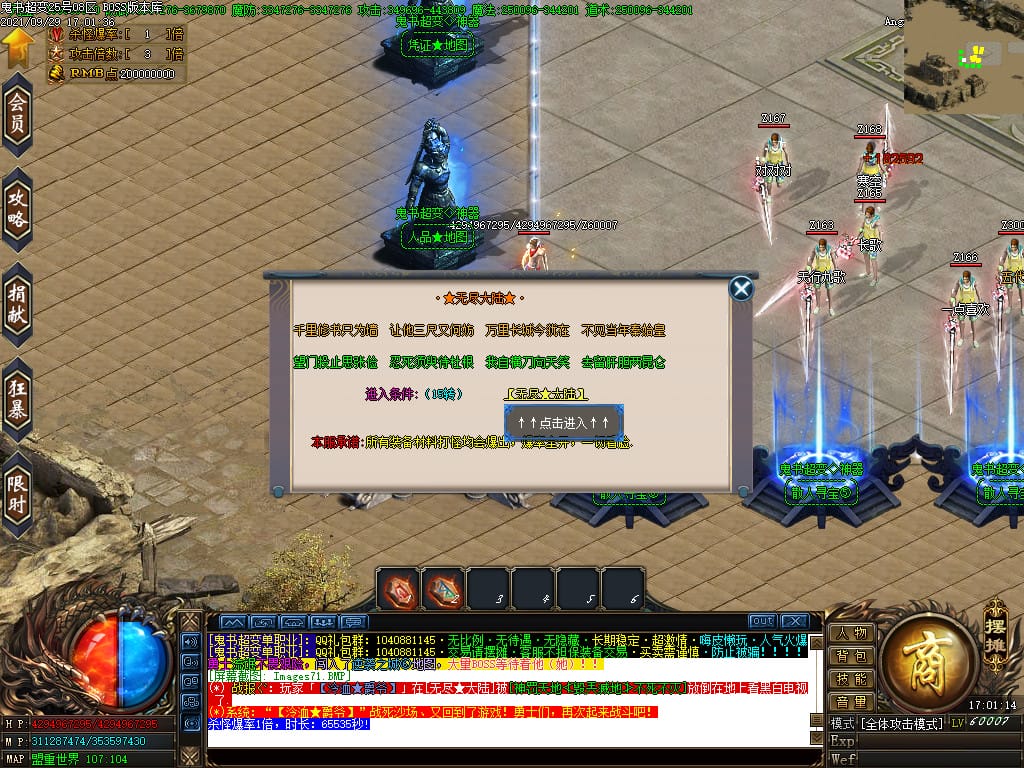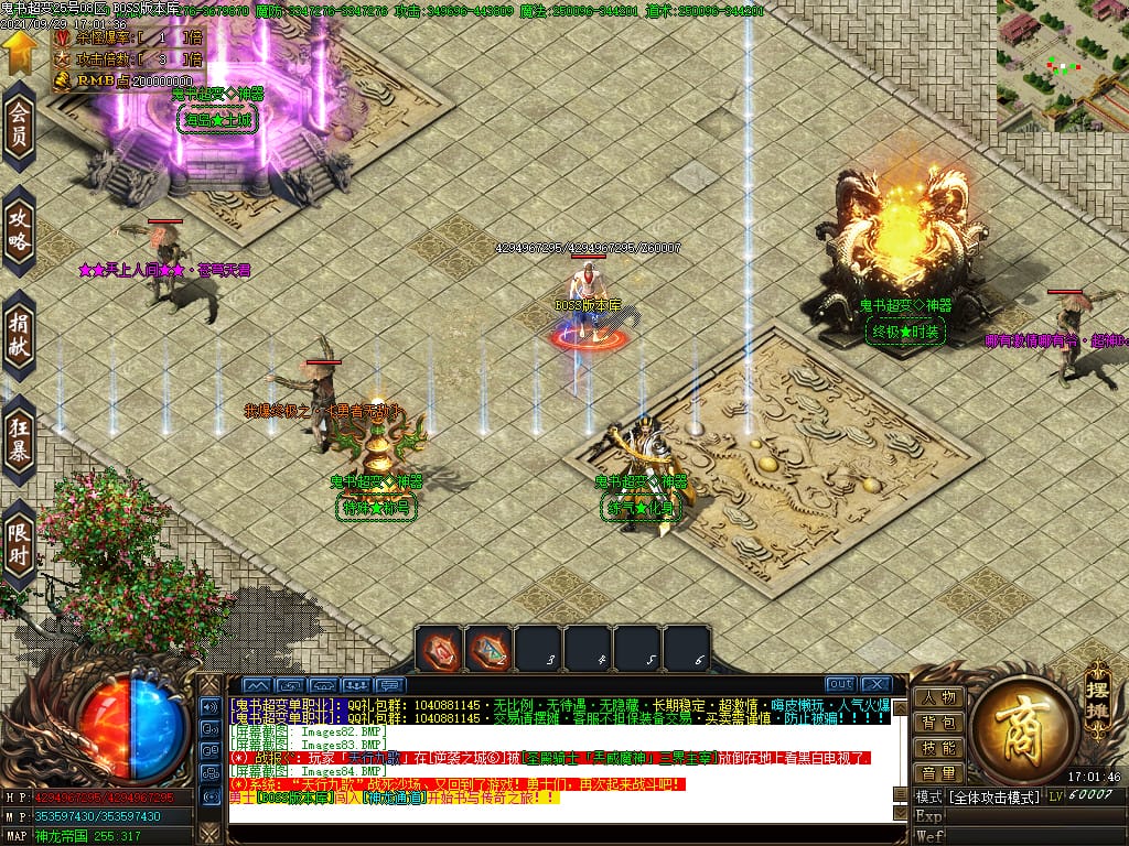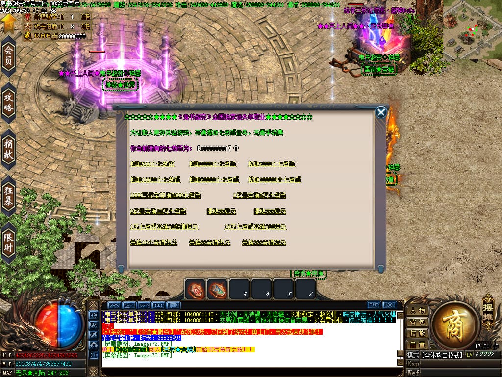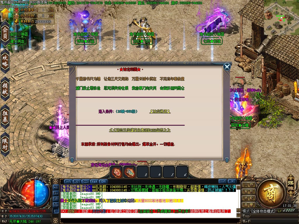 3.转生,等级,爵位都拥有终极大陆,本服活动奖励非常丰厚,记得定时参加,可爆出终极装备