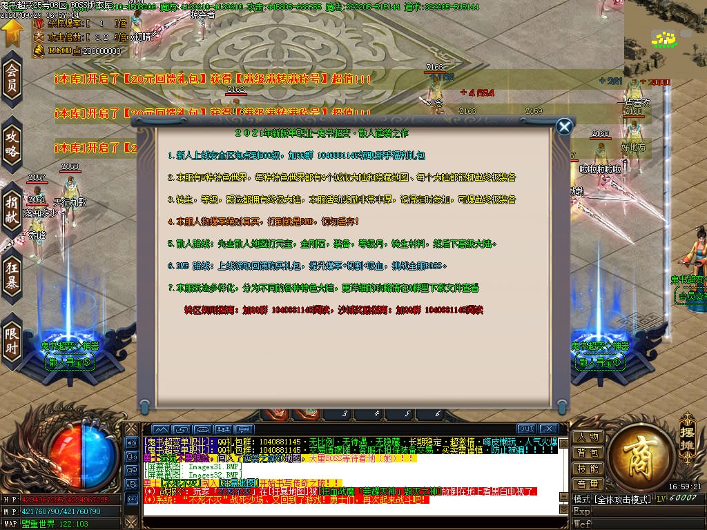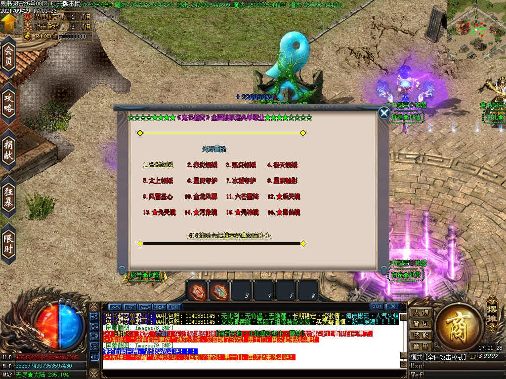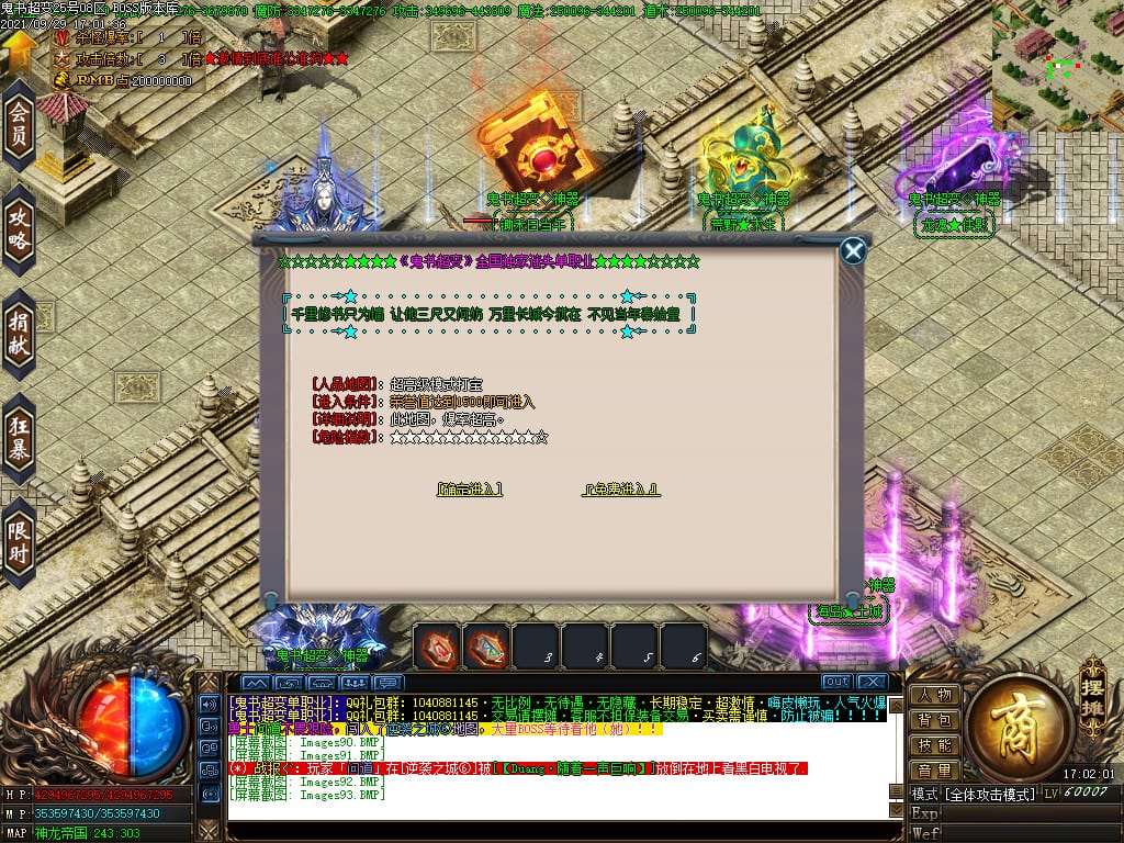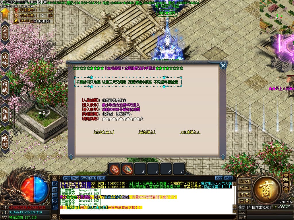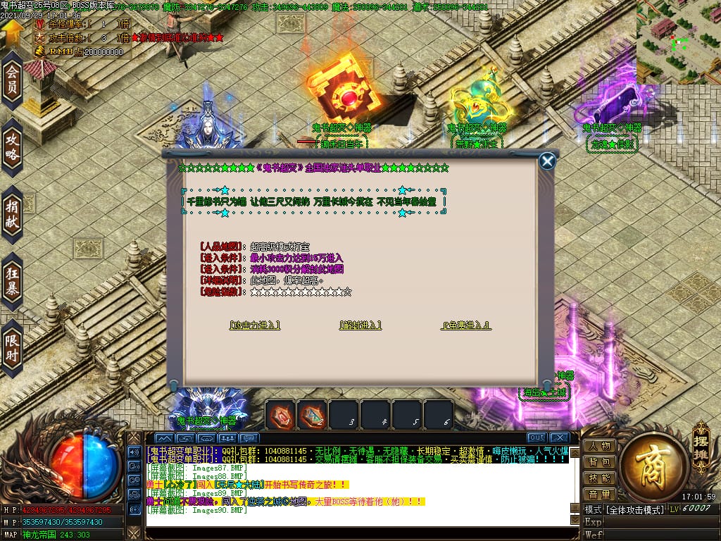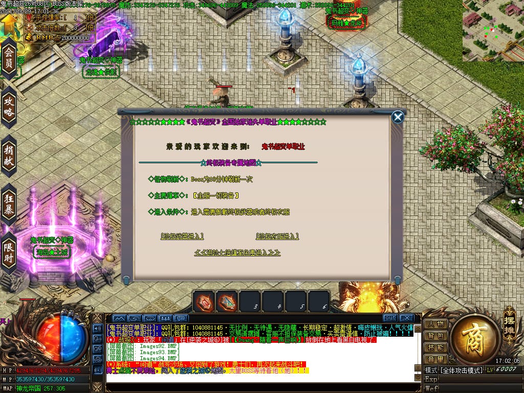 3.转生,等级,爵位都拥有终极大陆,本服活动奖励非常丰厚,记得定时参加,可爆出终极装备