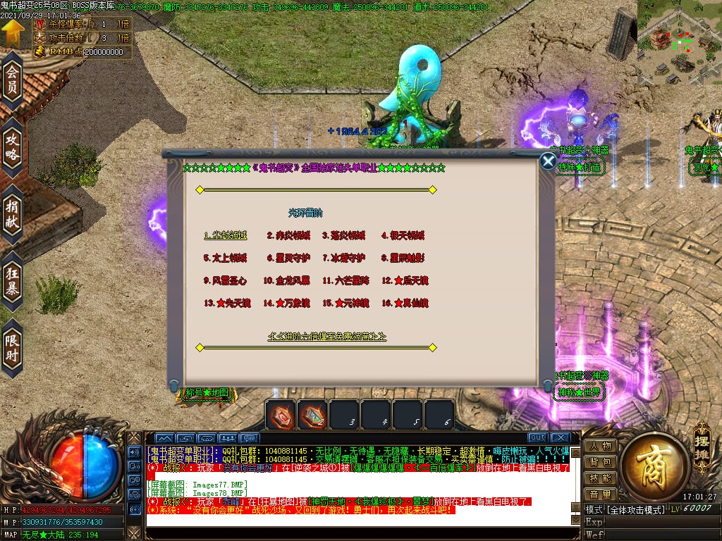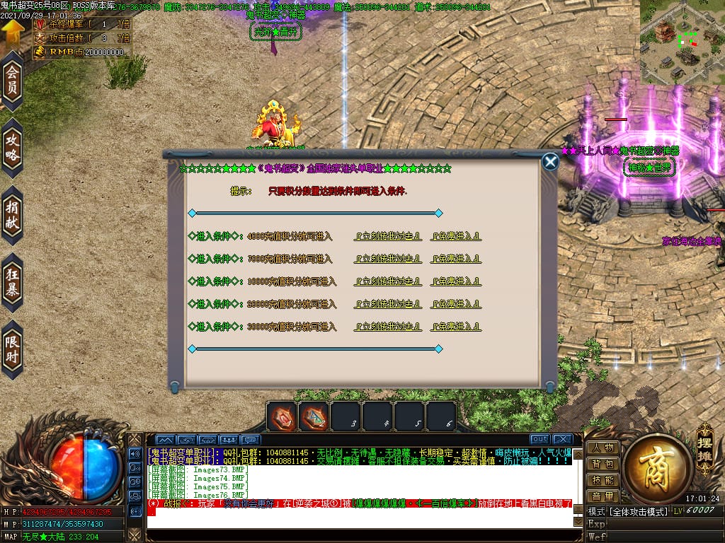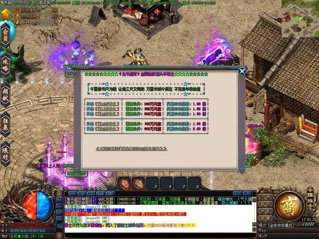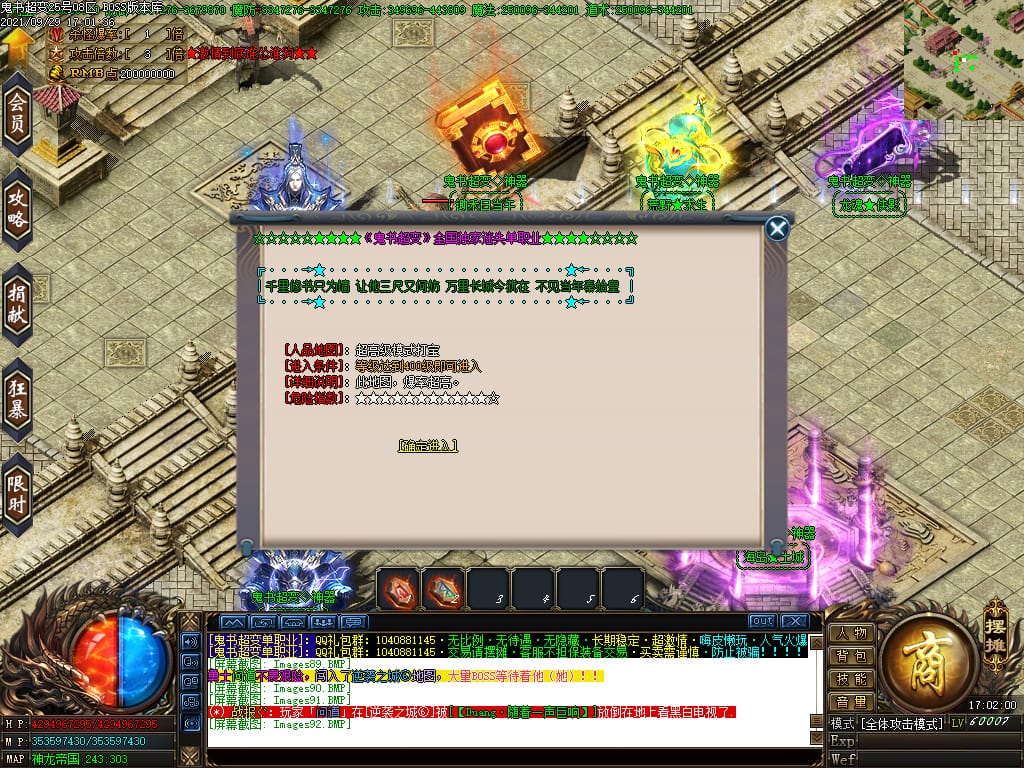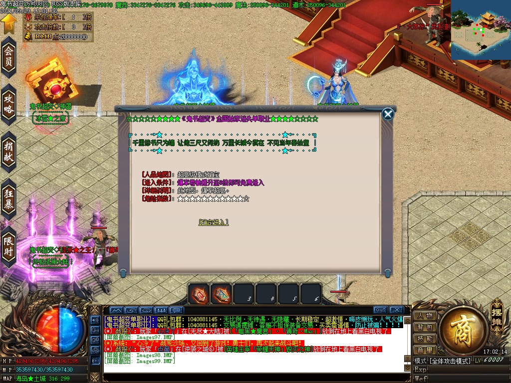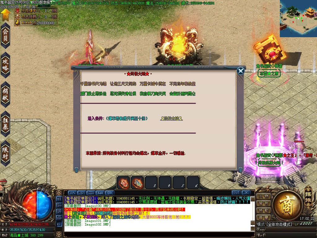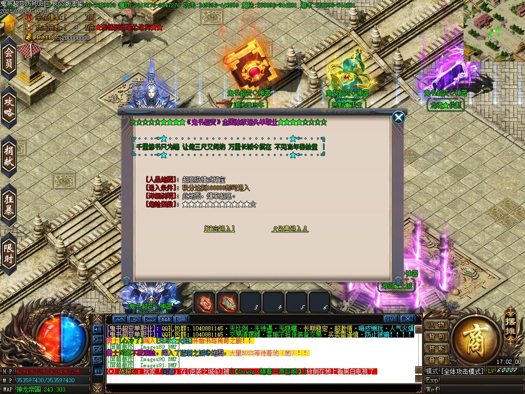 3.转生,等级,爵位都拥有终极大陆,本服活动奖励非常丰厚,记得定时参加,可爆出终极装备