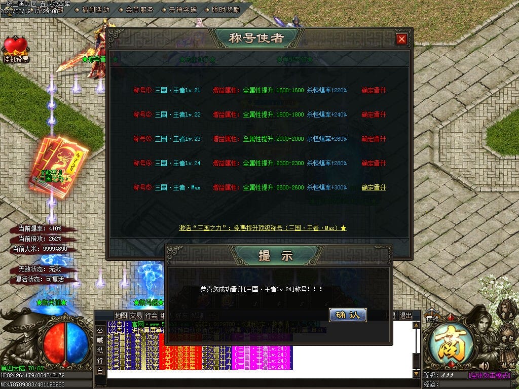 友情提醒:领取赞助回馈礼包可免费提升至600级也可以打怪获得等级丹提升