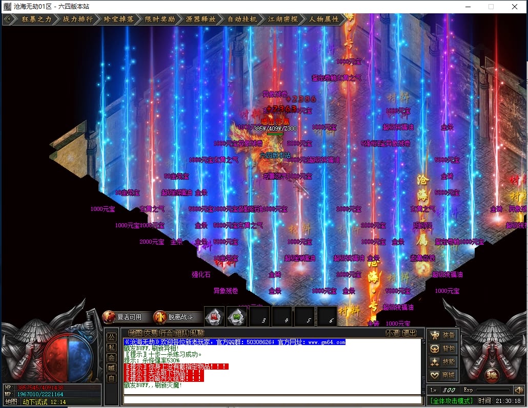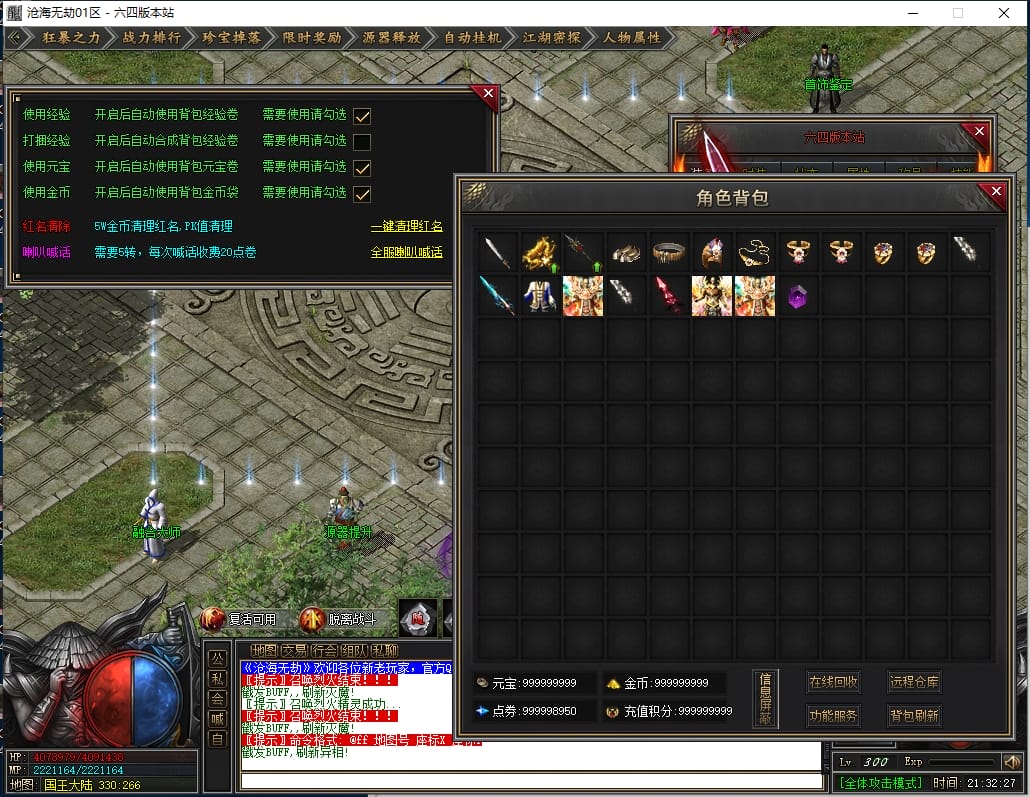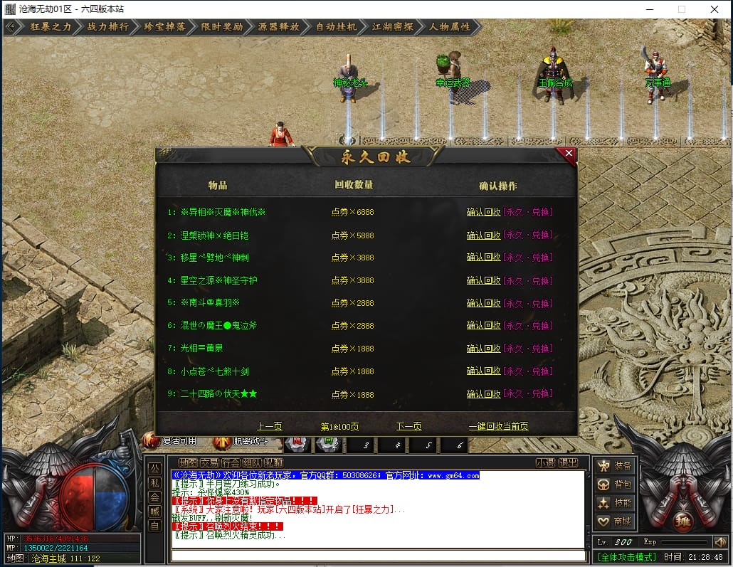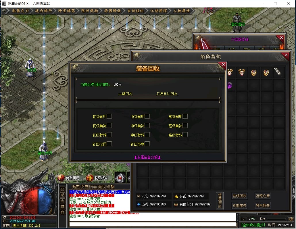 总计:1050点券+38W元宝 《优势:爆率加成,自动回收,回收加成,搬砖必备》