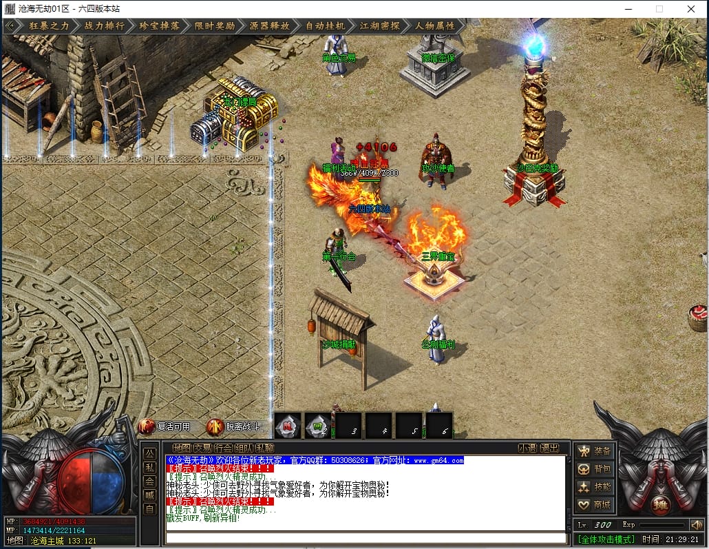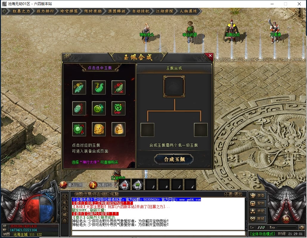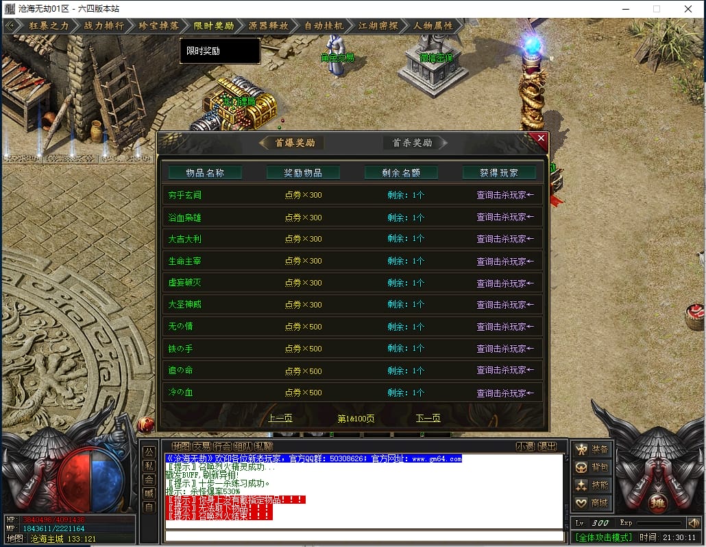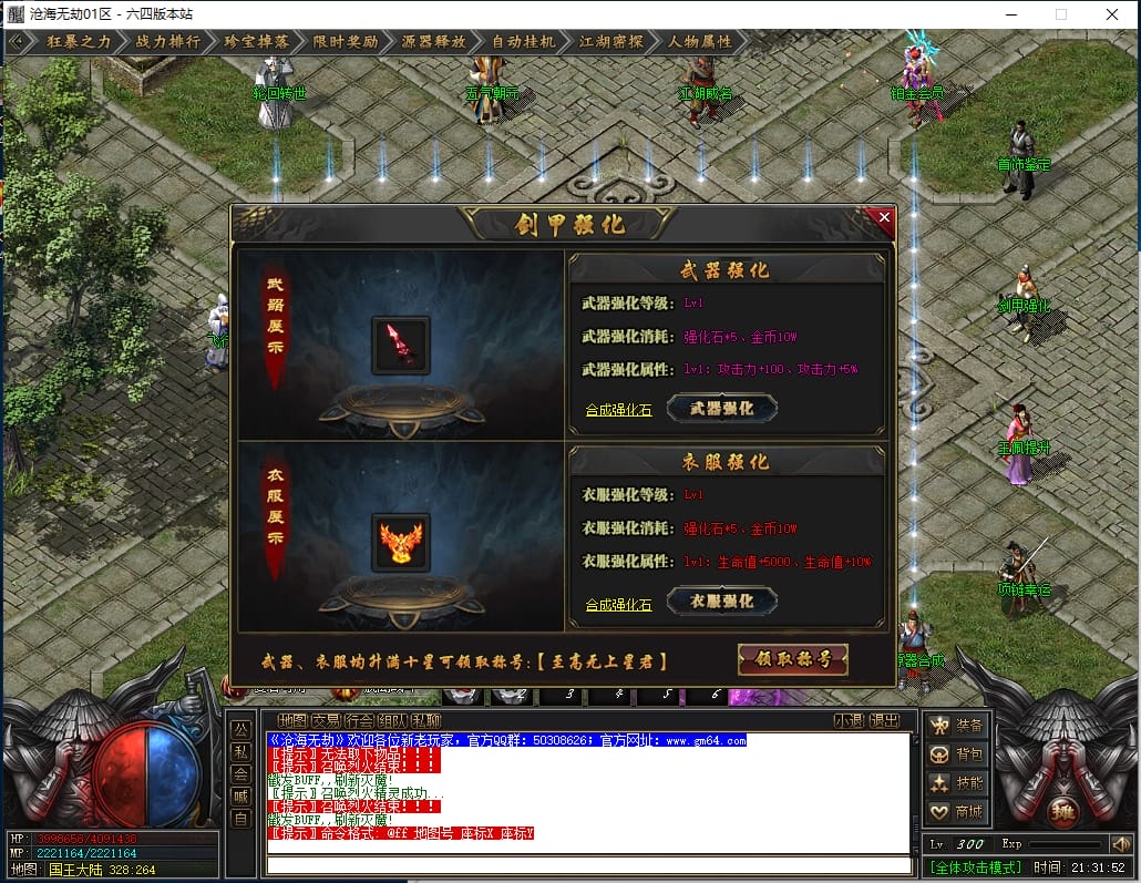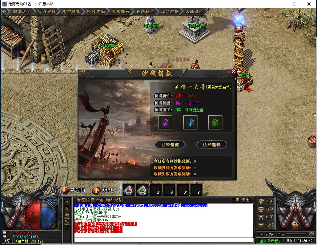 1.沙城捐献:1000点券(打怪爆率+100%,神技·十步一杀,可选唯一重宝:冥火紫晶·一重、神圣璇石·一重、魔龙之心·一重)