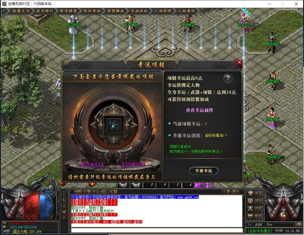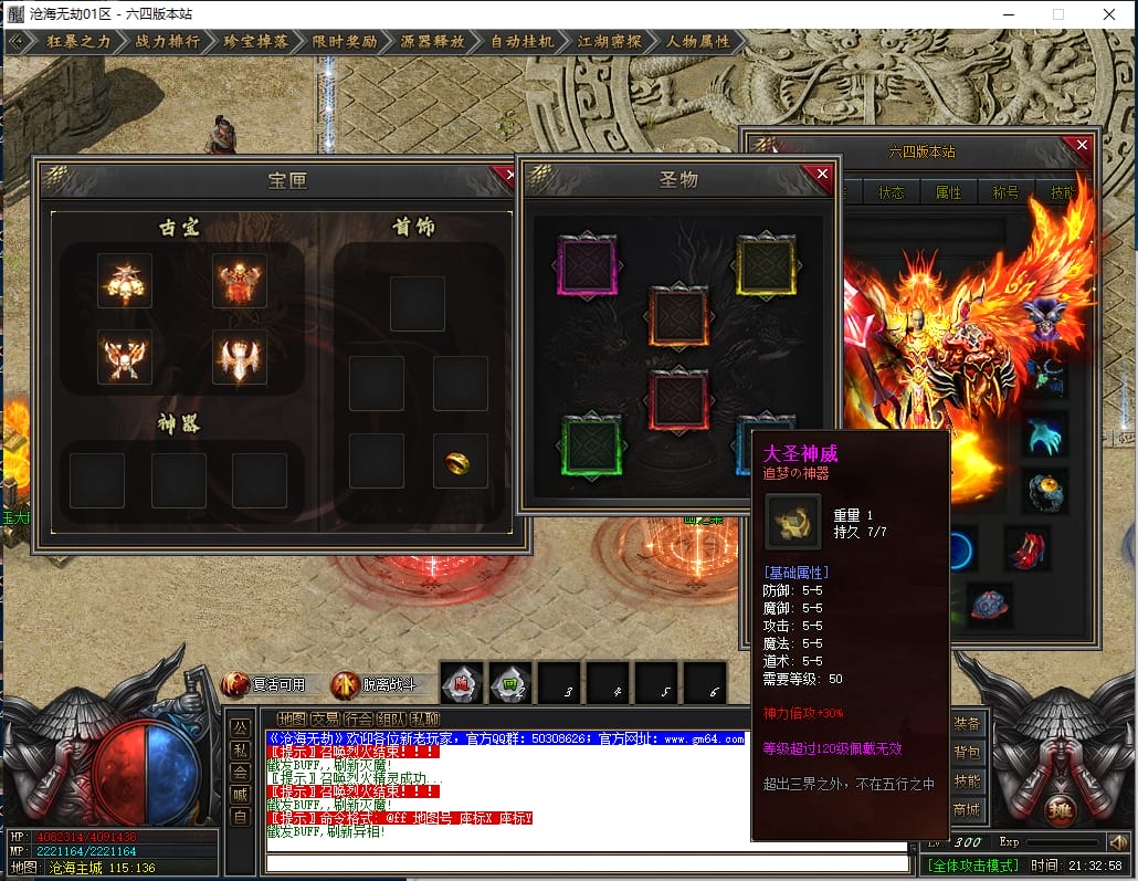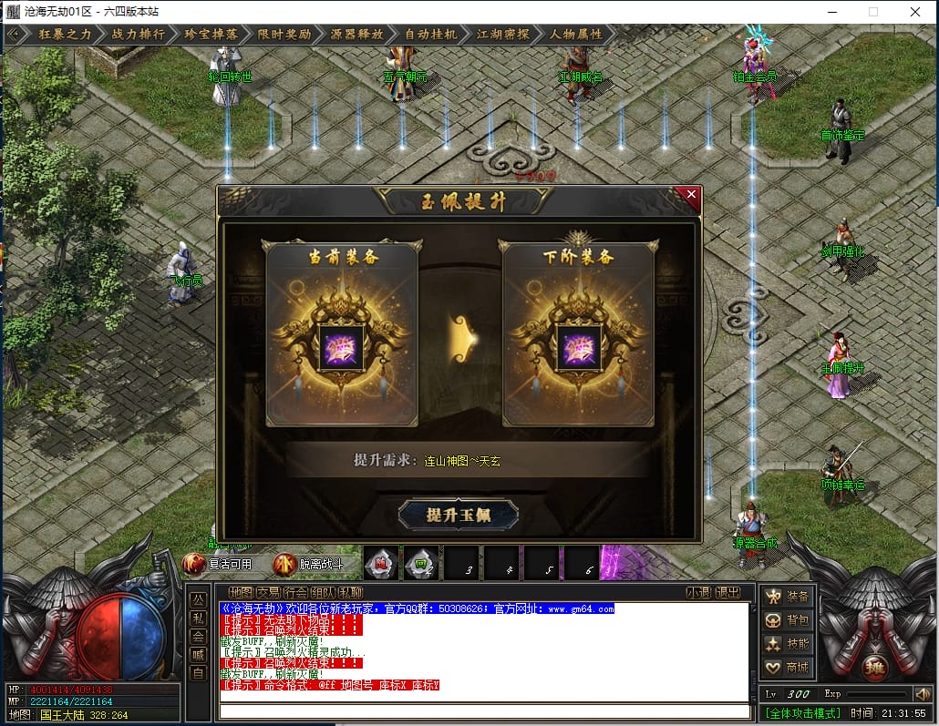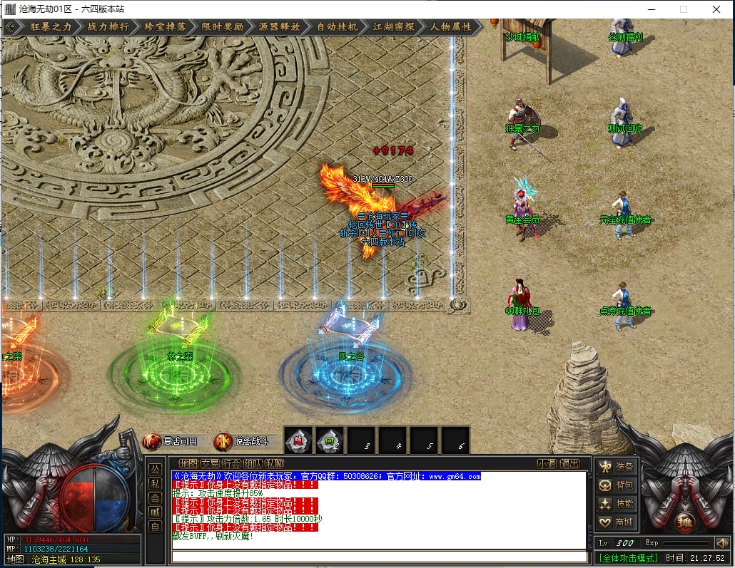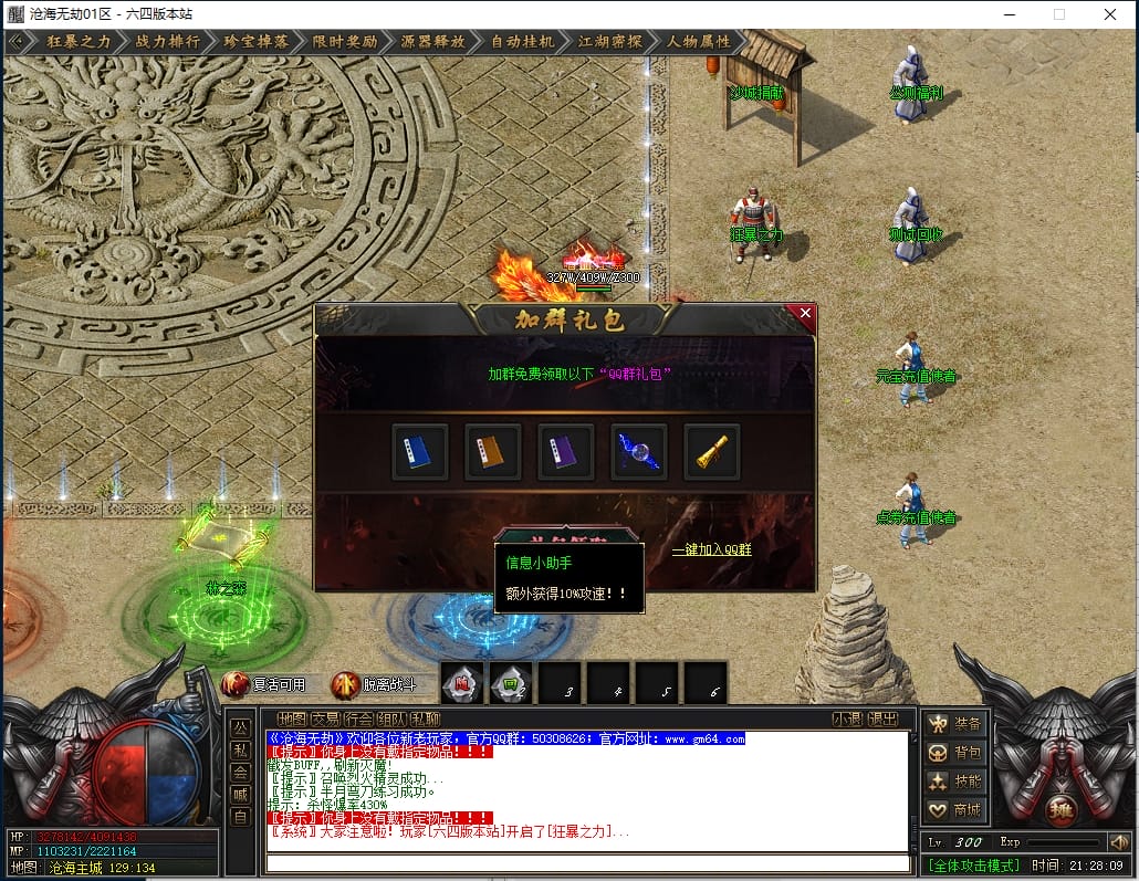 1.沙城捐献:1000点券(打怪爆率+100%,神技·十步一杀,可选唯一重宝:冥火紫晶·一重、神圣璇石·一重、魔龙之心·一重)
