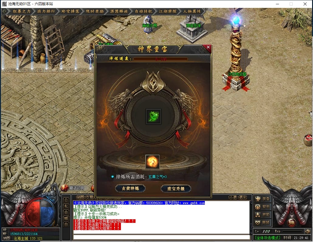 3.重宝·四重:400个玄黄之气(主城上方 三界重宝npc 提升,成长值随机增加,实际消耗略有出入,脸白选手还能打折,商铺点券购买玄黄之气)