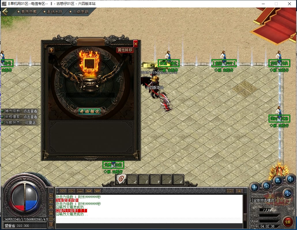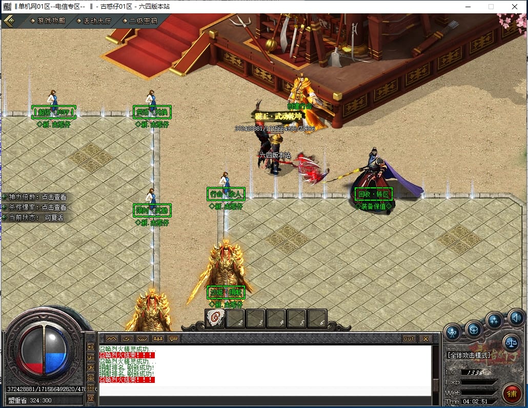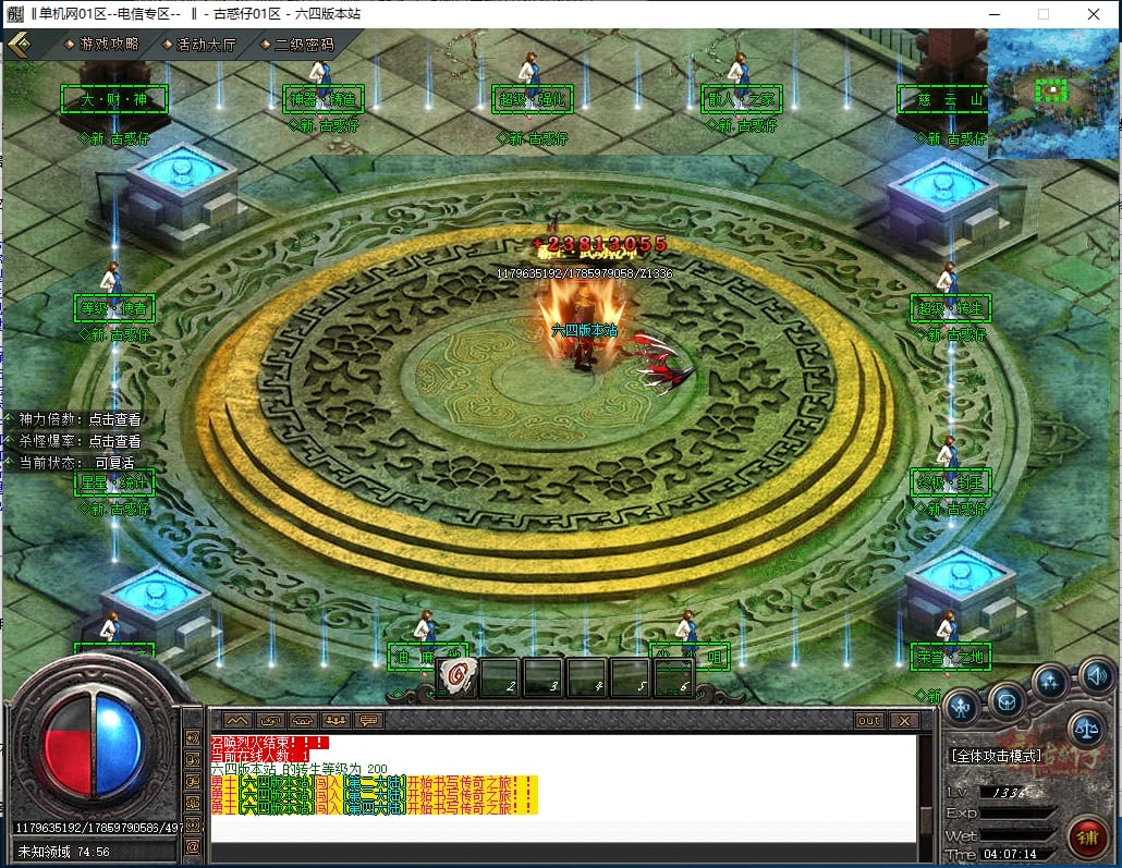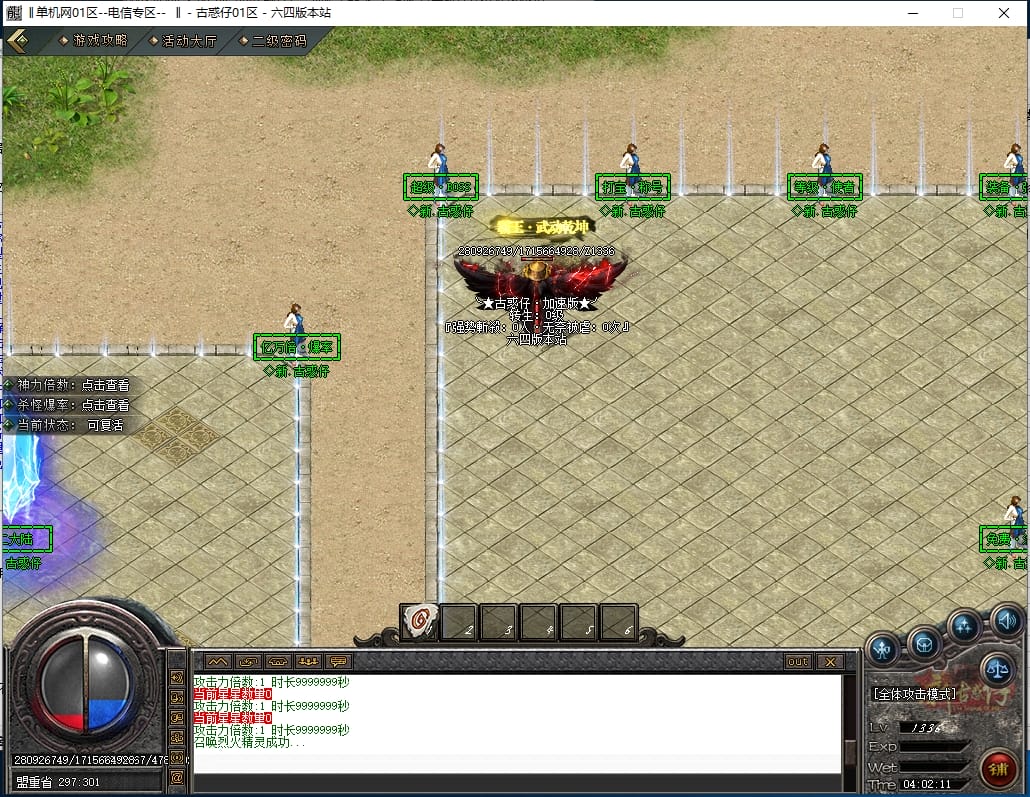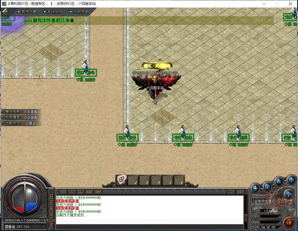 <进入新手地图配合仙术-至尊召唤既可打宝,游戏所有怪物都可爆出终极,一切看脸。