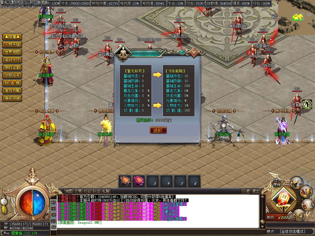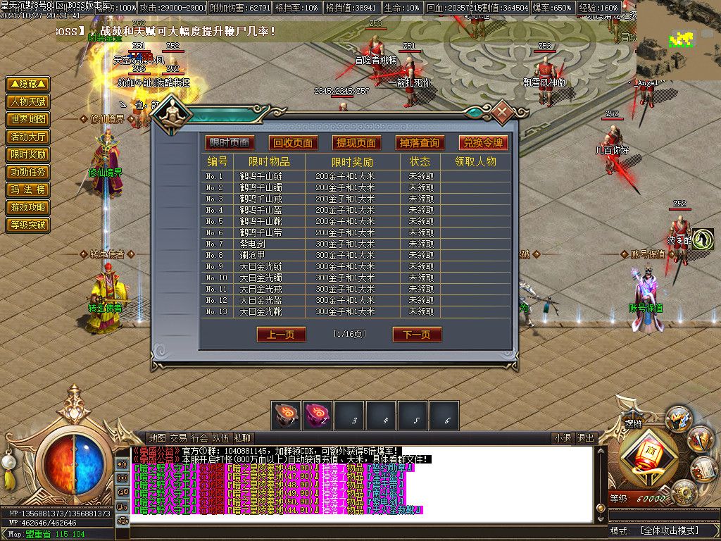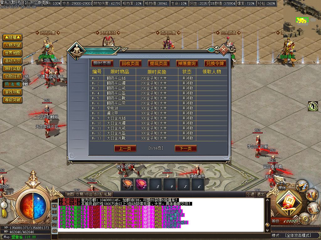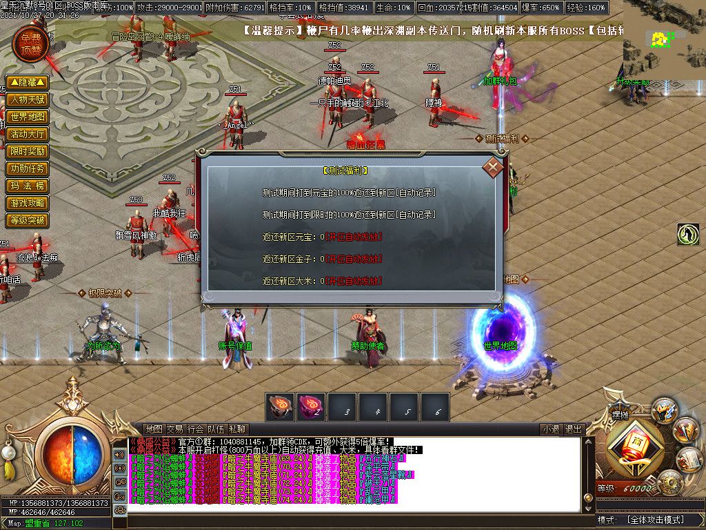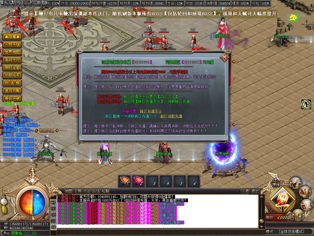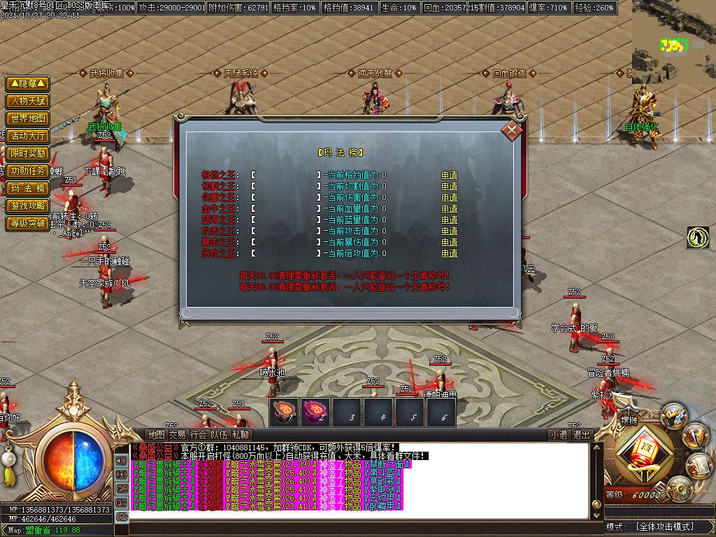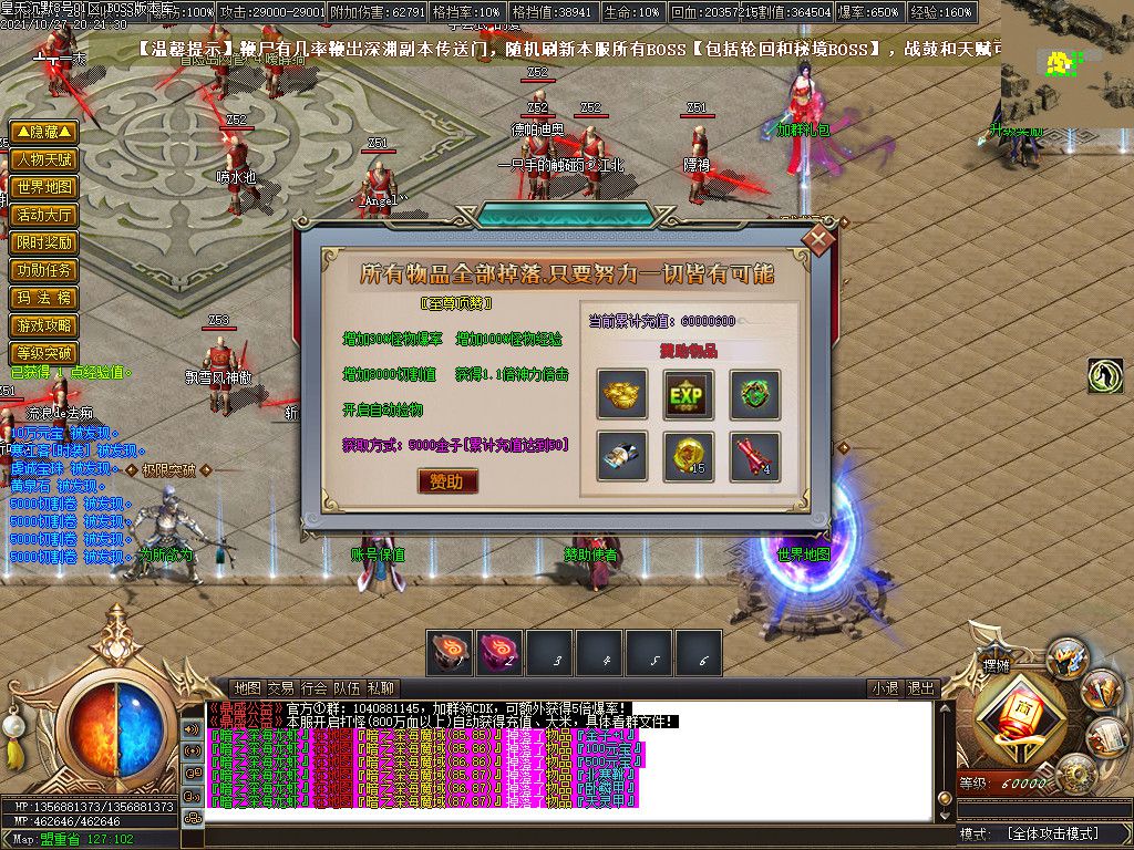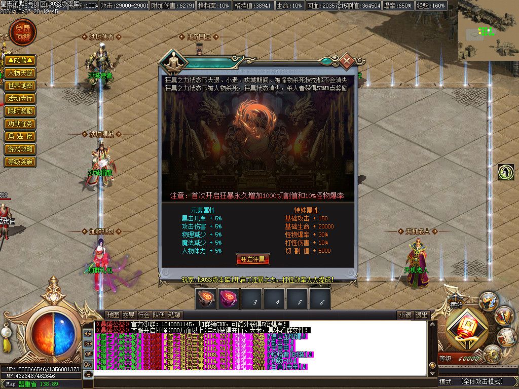 【狂暴系统】: 本服狂暴10R=100大米 永久赠送 切割值+1000 怪物爆率+10% 死亡不小时 开启属性 切割值+5000 怪物爆率+30% 打怪伤害+10%生命值+3000 基础攻击+150 全米素+5% 死亡消失 击杀者可获得50大米