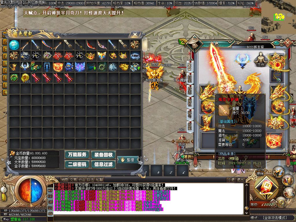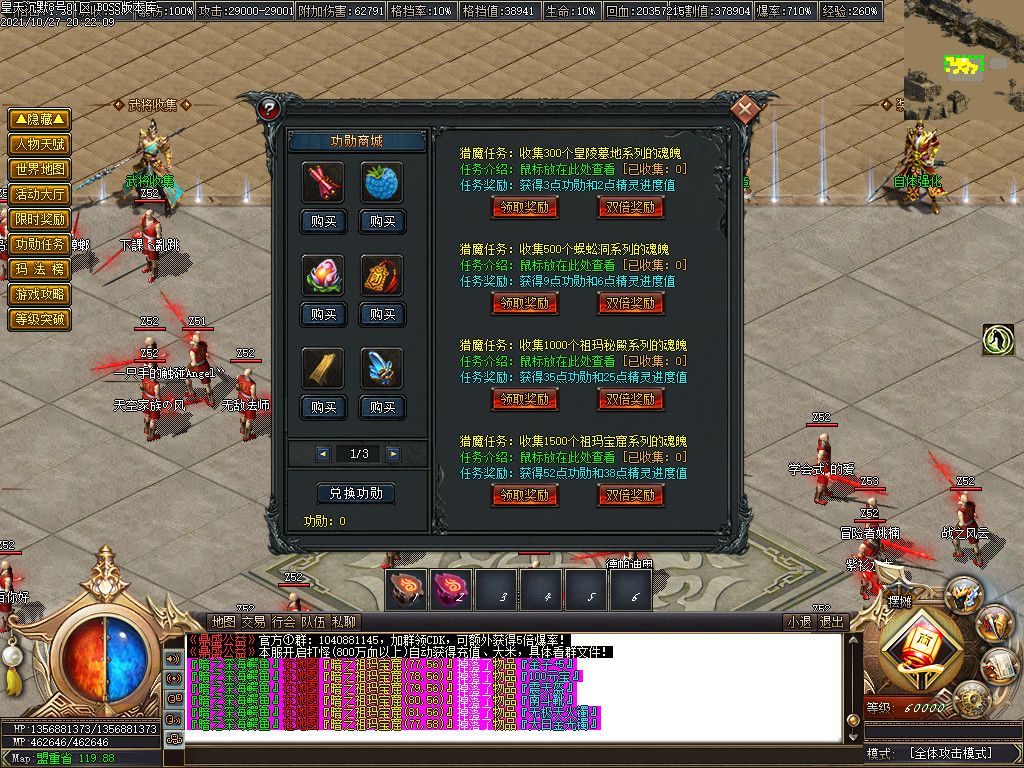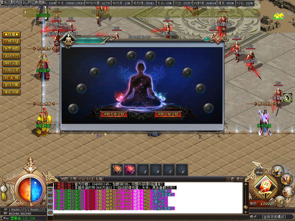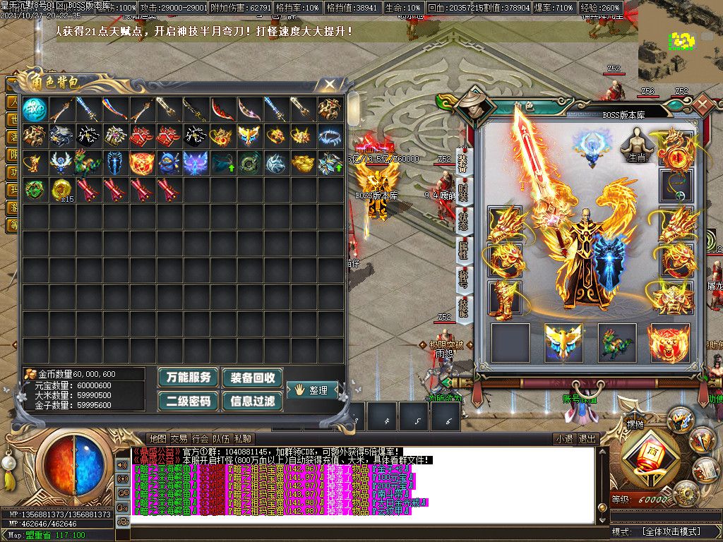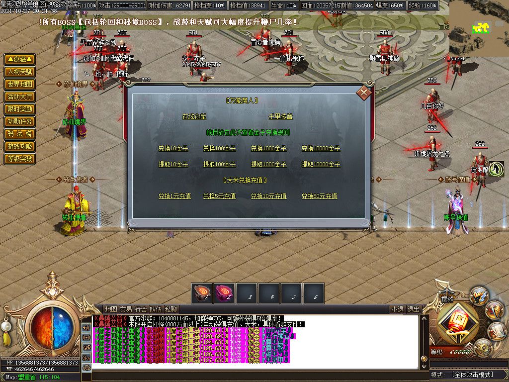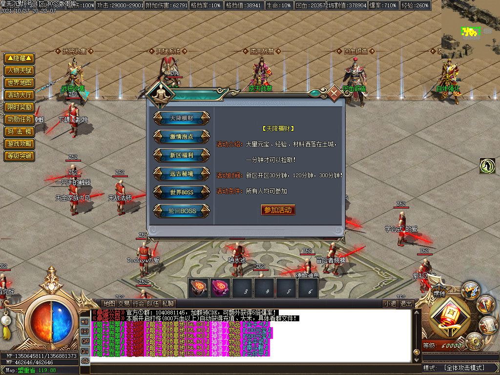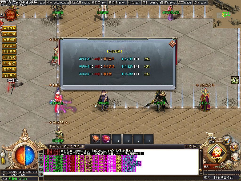 【狂暴系统】: 本服狂暴10R=100大米 永久赠送 切割值+1000 怪物爆率+10% 死亡不小时 开启属性 切割值+5000 怪物爆率+30% 打怪伤害+10%生命值+3000 基础攻击+150 全米素+5% 死亡消失 击杀者可获得50大米