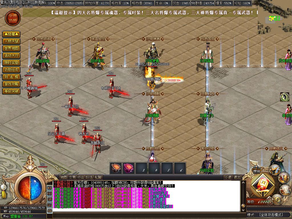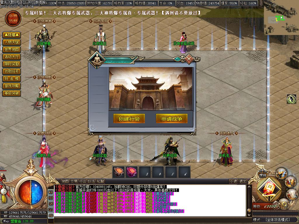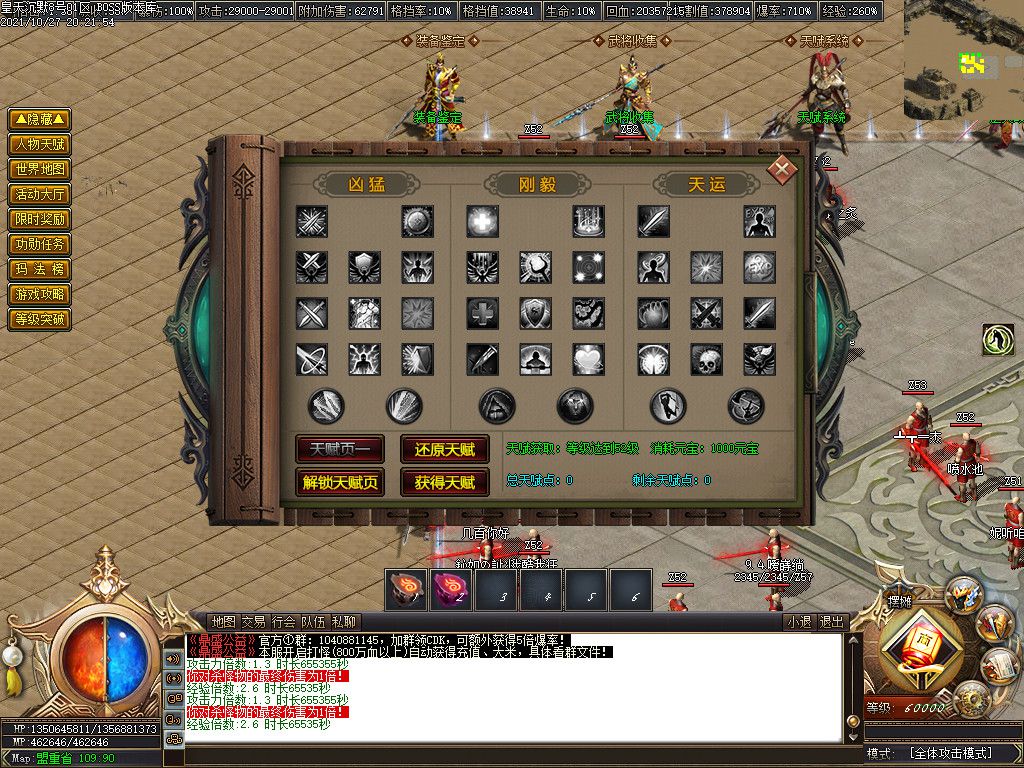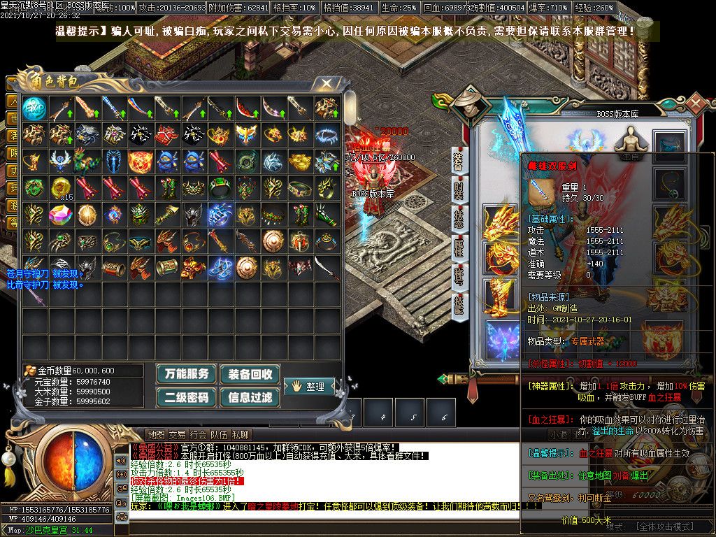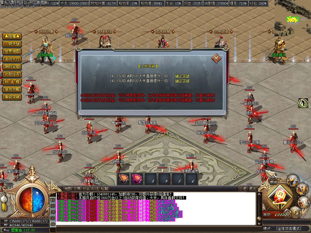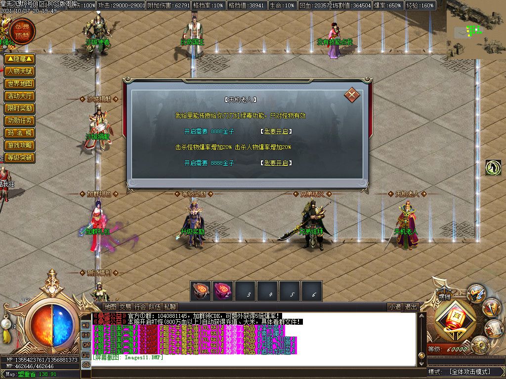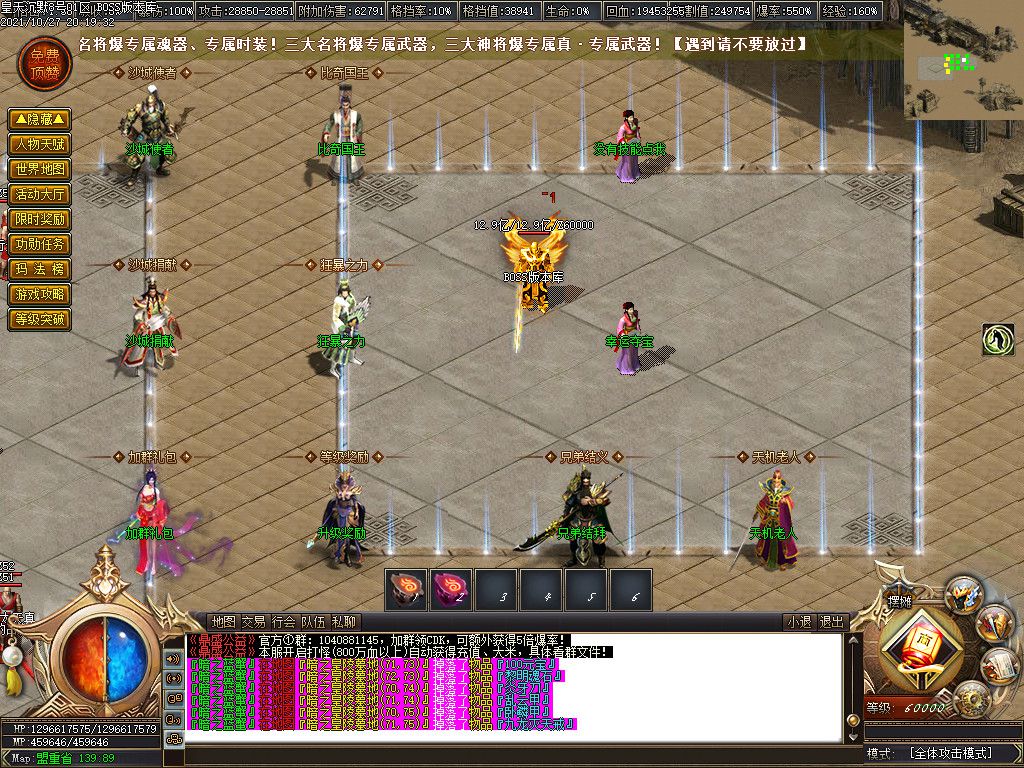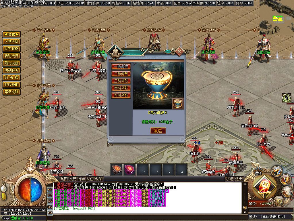 【狂暴系统】: 本服狂暴10R=100大米 永久赠送 切割值+1000 怪物爆率+10% 死亡不小时 开启属性 切割值+5000 怪物爆率+30% 打怪伤害+10%生命值+3000 基础攻击+150 全米素+5% 死亡消失 击杀者可获得50大米