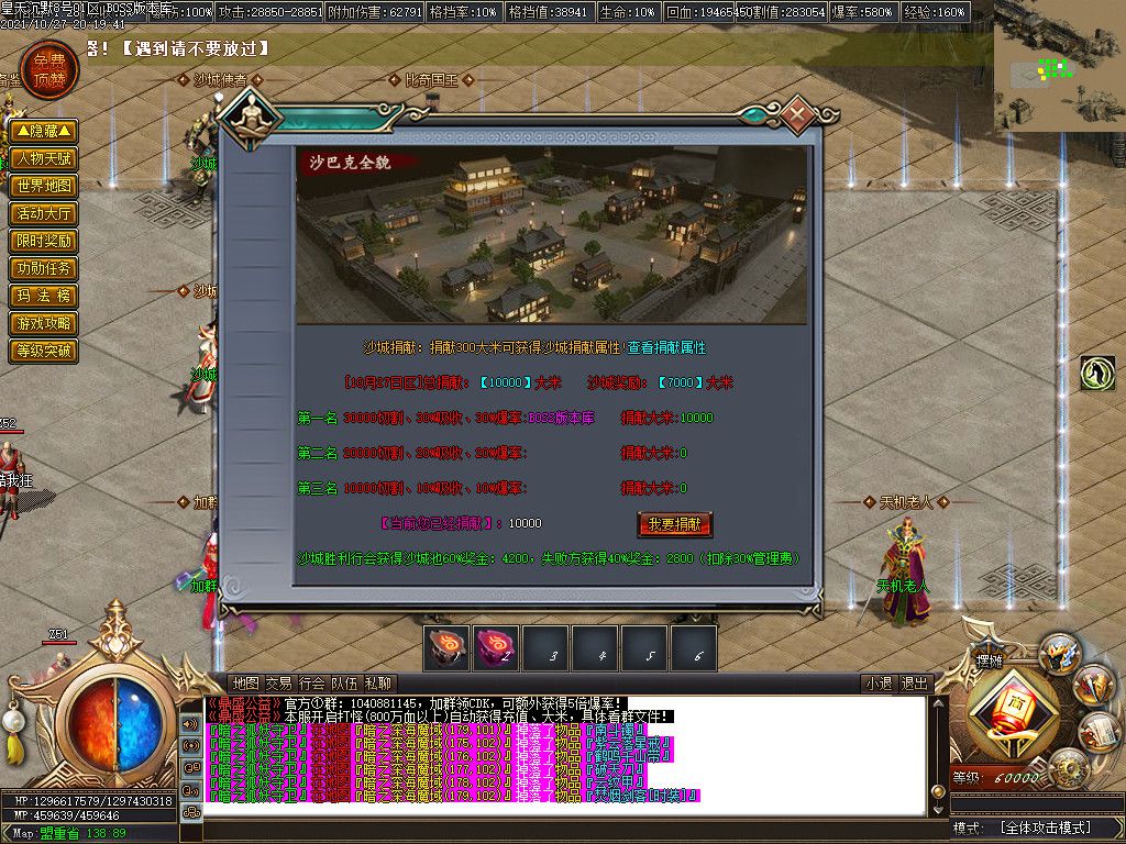 【沙捐赞助】: 本服沙捐30R=300大米 开启自动回收 打怪切割+20% 怪物爆率+30% 装备回收+50% 最大生命值+10% 倍攻+1.1