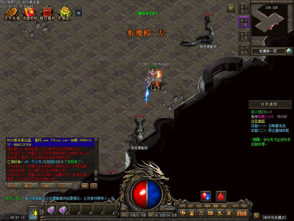 2.蛇魔殿1-5层也可挂机,但也需要注意,怪物量要比真天宫多一些,谨慎挂机,务必打好保护,同时可以打到神器打造的必须材料。