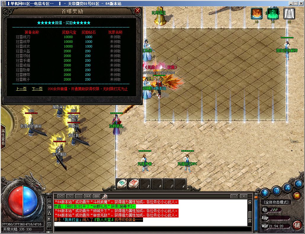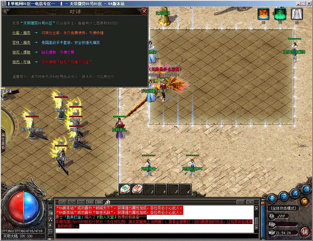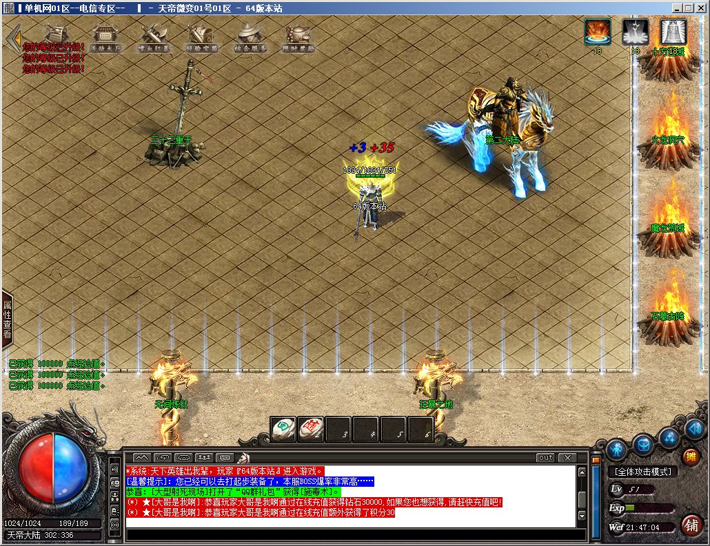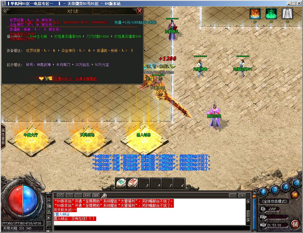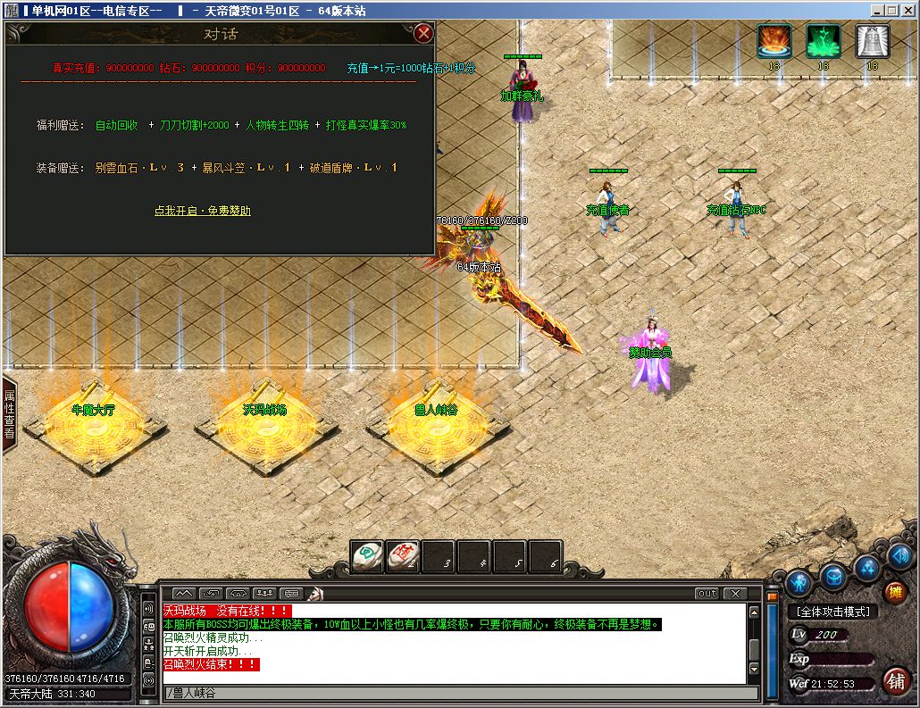 本服充值1元=1000钻石+1积分(无任何比例,请大家避免上当受骗),装备全部靠打(回归最原始的玩法,让玩家体验爆装备的快感)。