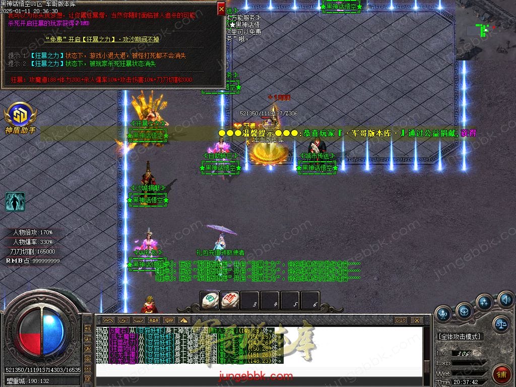 沙城捐献,狂暴之力,赠送各种神技以及道具奖励,PK打宝,事半功倍